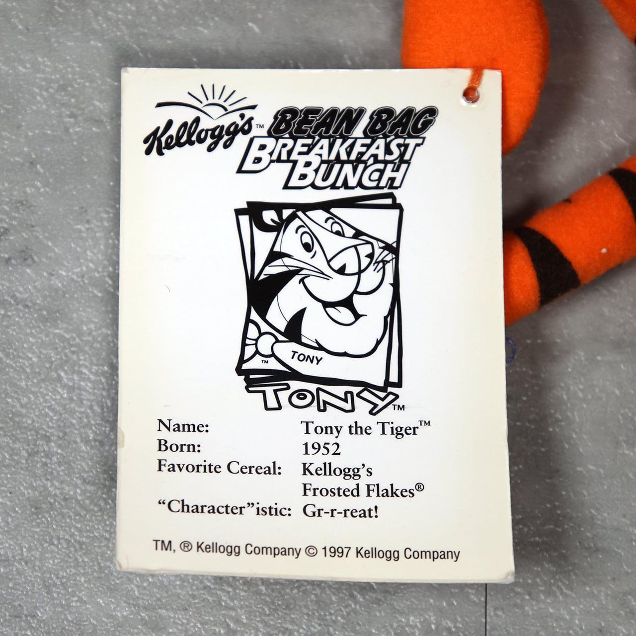 Kellogg's の人気キャラクター Tony the Tiger の 1997年 Bean Bag Breakfast Bunch シリーズぬいぐるみです。