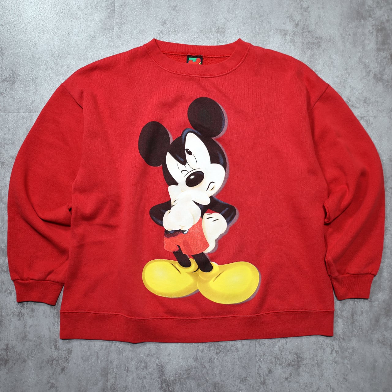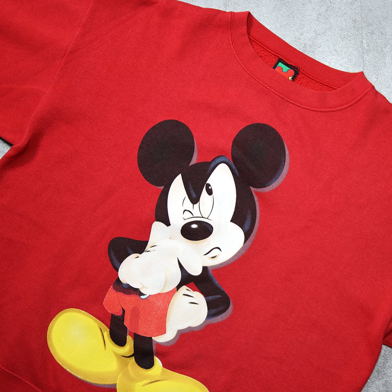 ミッキーが不機嫌そうに頬杖をつく、ユーモアのある表情が特徴。90年代らしい大判プリントで、赤ボディとの相性も良く、1枚で主役級のインパクトがあります。