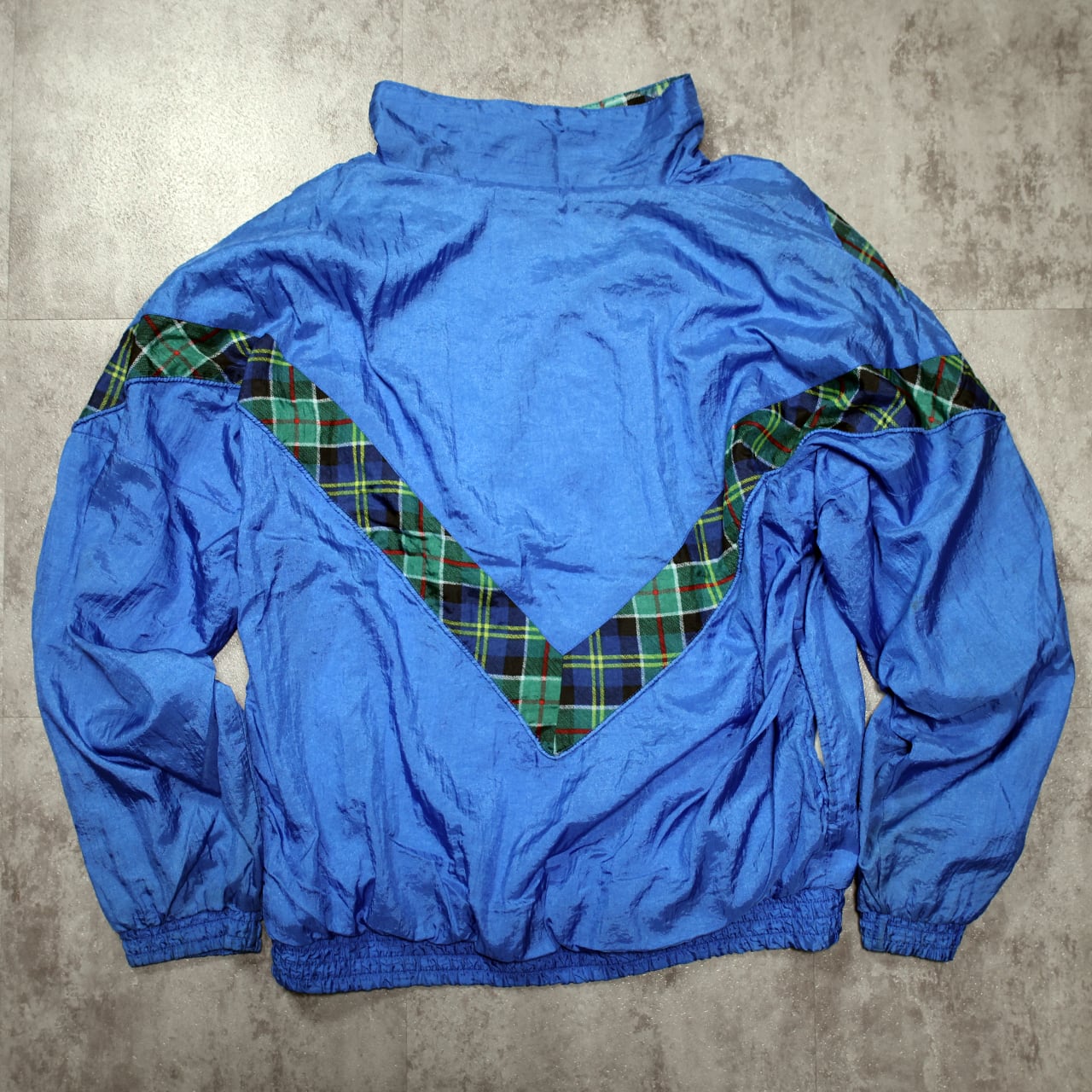 鮮やかなブルーのナイロン生地に、グリーン×ブラック×レッドのチェック柄の切り替えが映える、非常に珍しいデザインのヴィンテージアイテムです。
