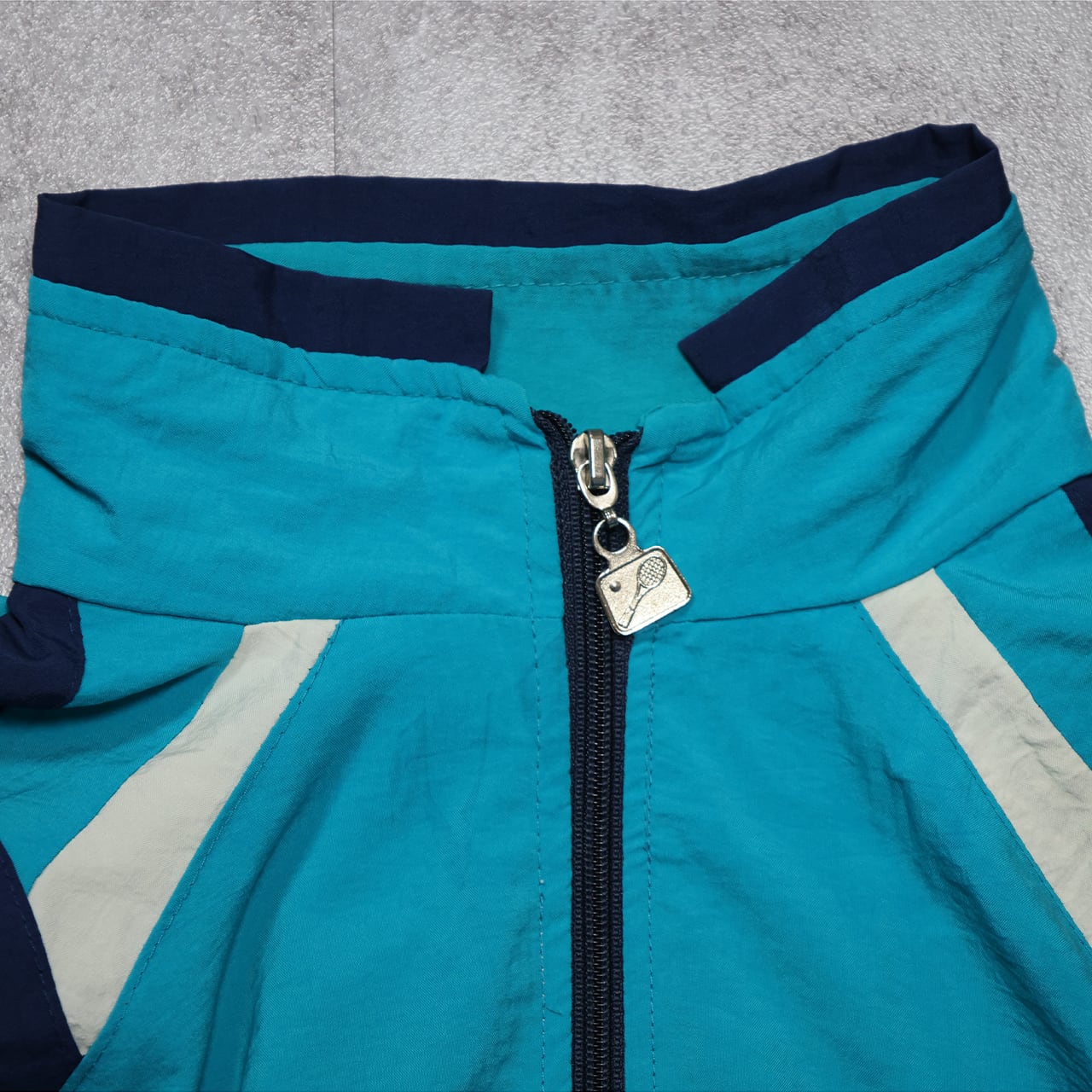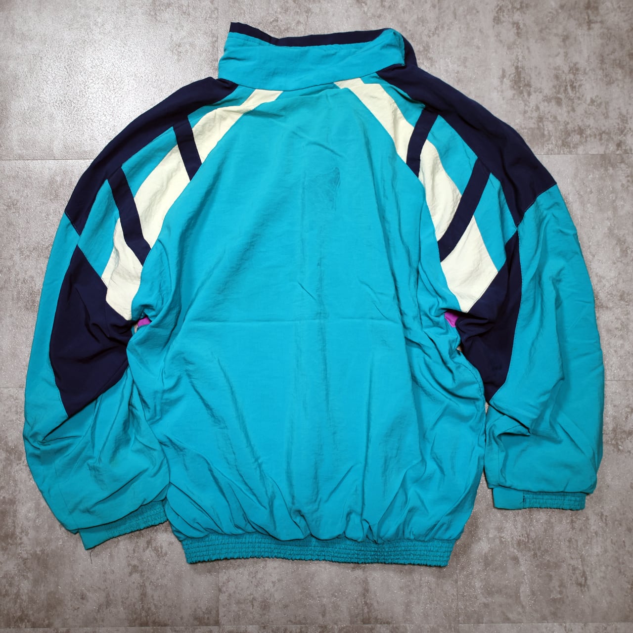 ターコイズブルー × パープル × ネイビー × オフホワイトの絶妙なカラーリングが目を引く、90sらしいレトロスポーティーな一枚です。