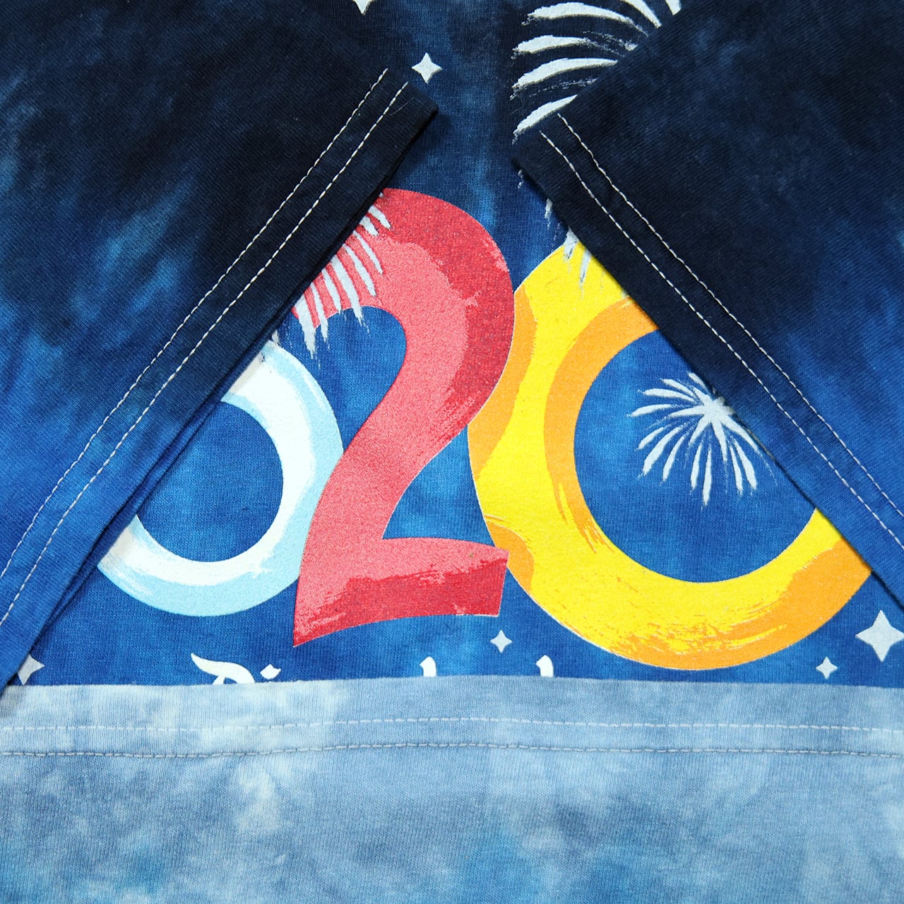 鮮やかなブルーを基調にしたタイダイ染めのボディに、花火と「2020」の大判グラフィックが映える1枚です。