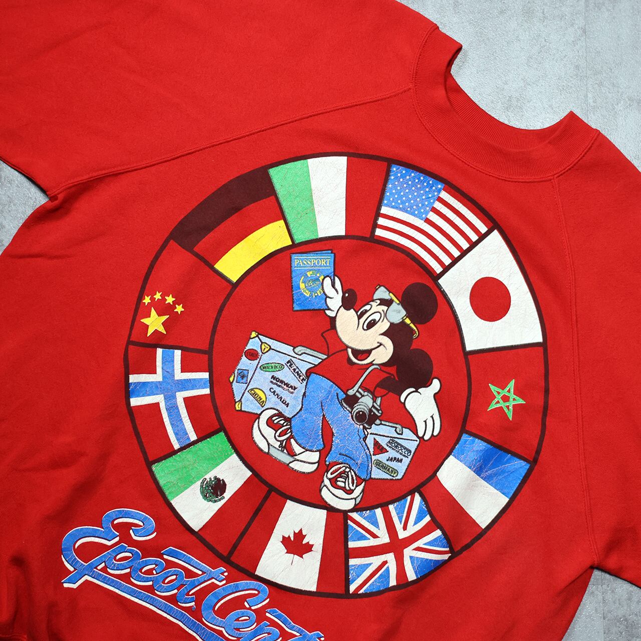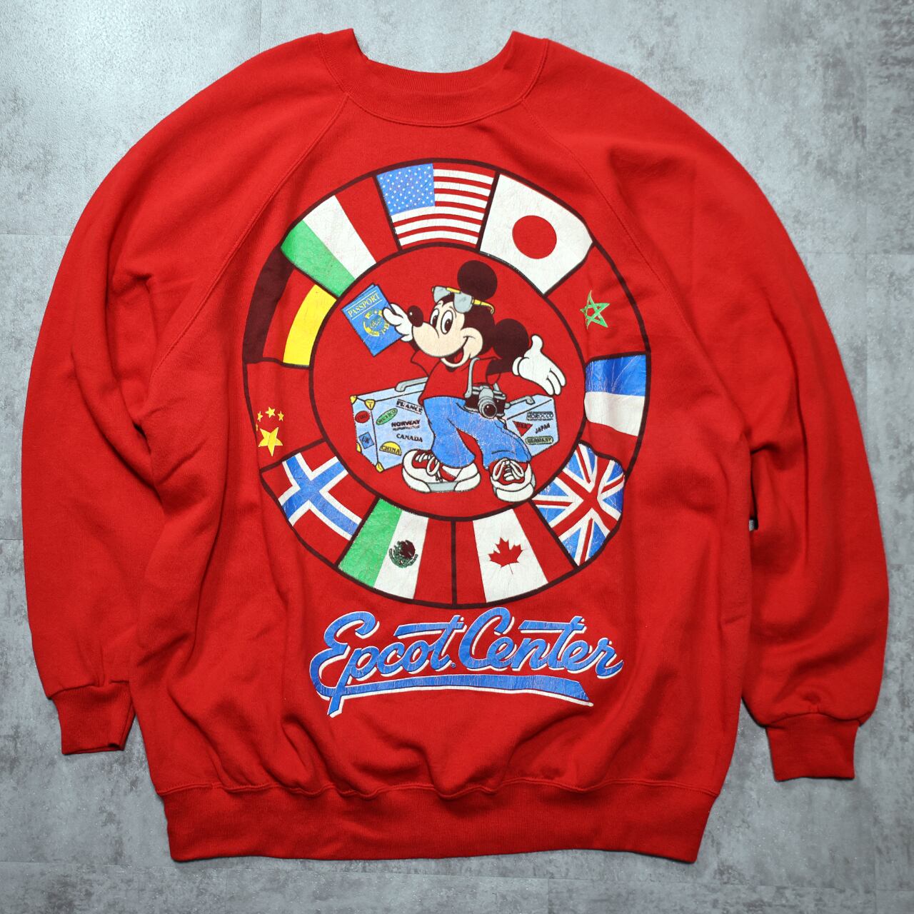 ウォルト・ディズニー・ワールドの Epcot Center(エプコットセンター) をテーマにした、90sオリジナルのミッキースウェット。円状に並ぶ 12カ国の国旗 × トラベルミッキー のデザインは、当時のWDWアイテムの中でも特に人気の高いグラフィックです。