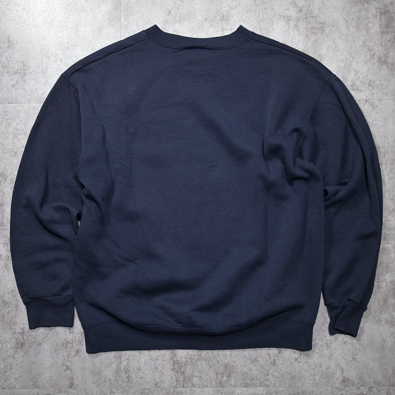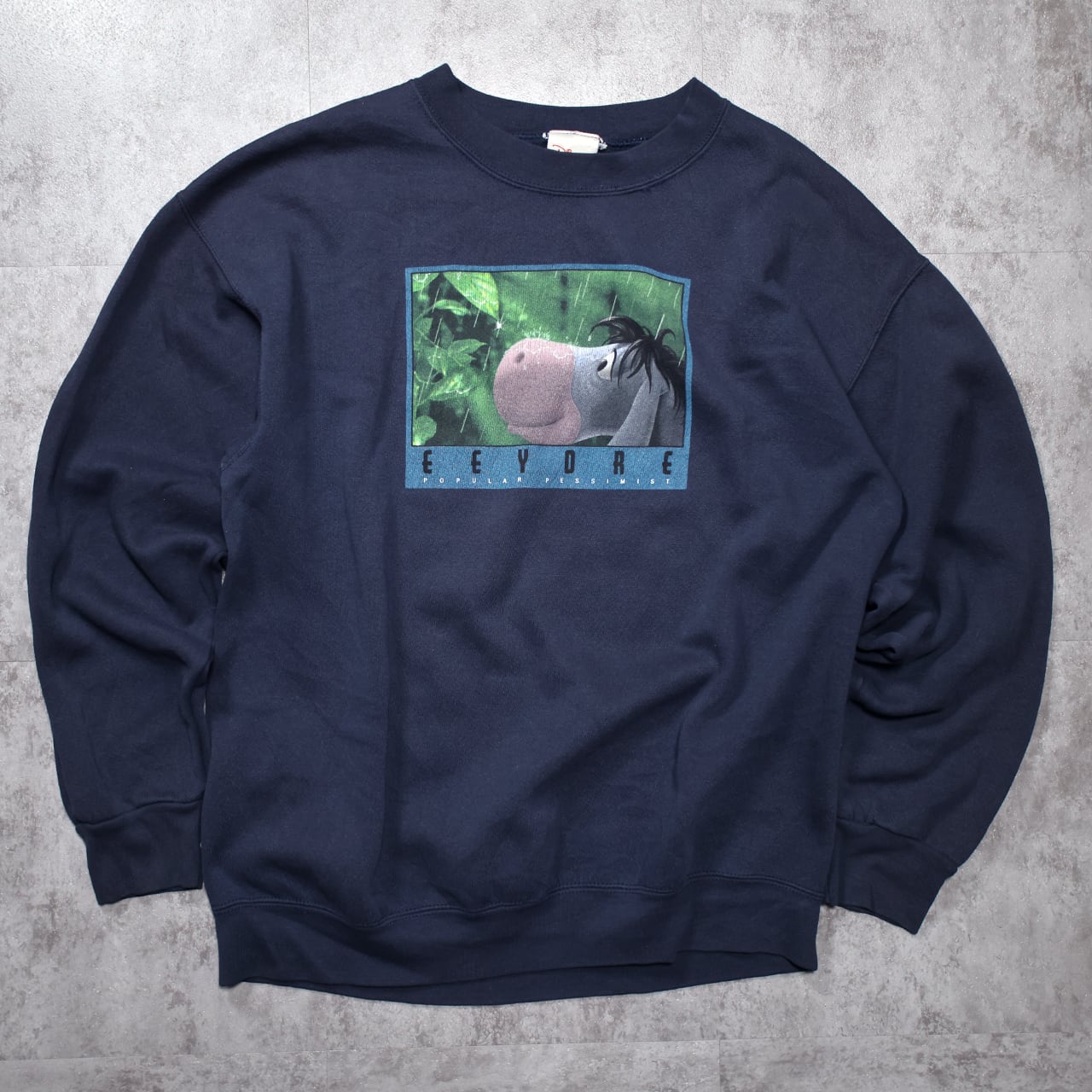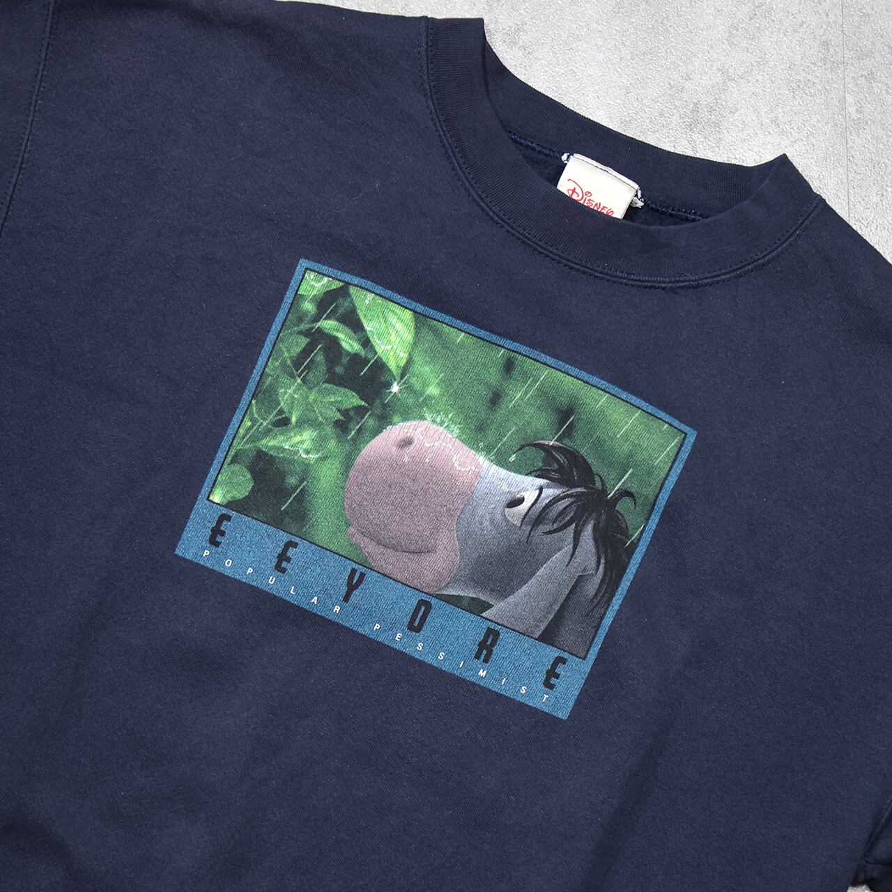 雨の中でたたずむ “Eeyore(イーヨー)” を描いた、90sオリジナルのアート系スウェット。グリーンの背景とイーヨーの淡いカラーがネイビーボディに映え、キャラクターものながら落ち着いた雰囲気で着られるデザインです。