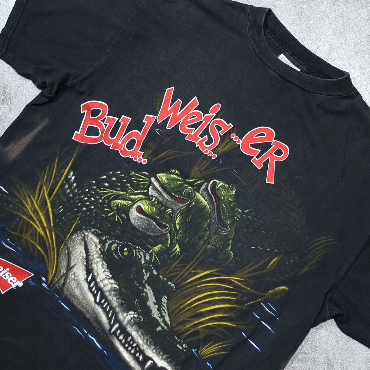 フロントには沼地から顔を出すカエルとワニの大判プリント、バックにはBudweiserの箱を背負って歩くワニのグラフィック。