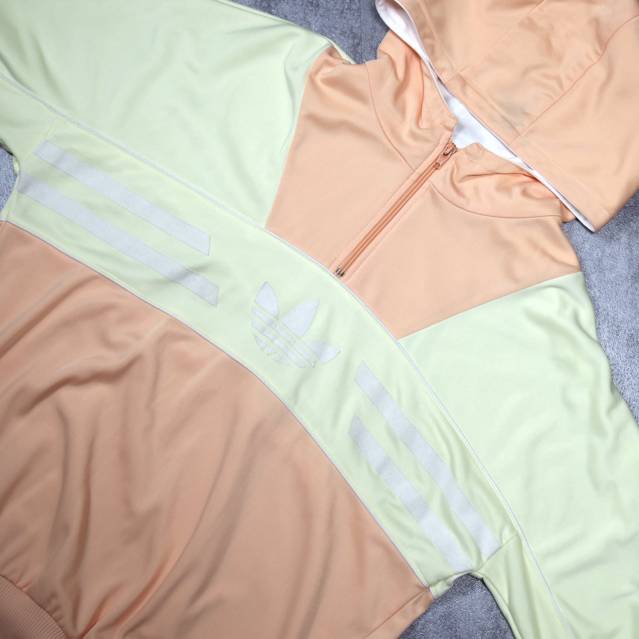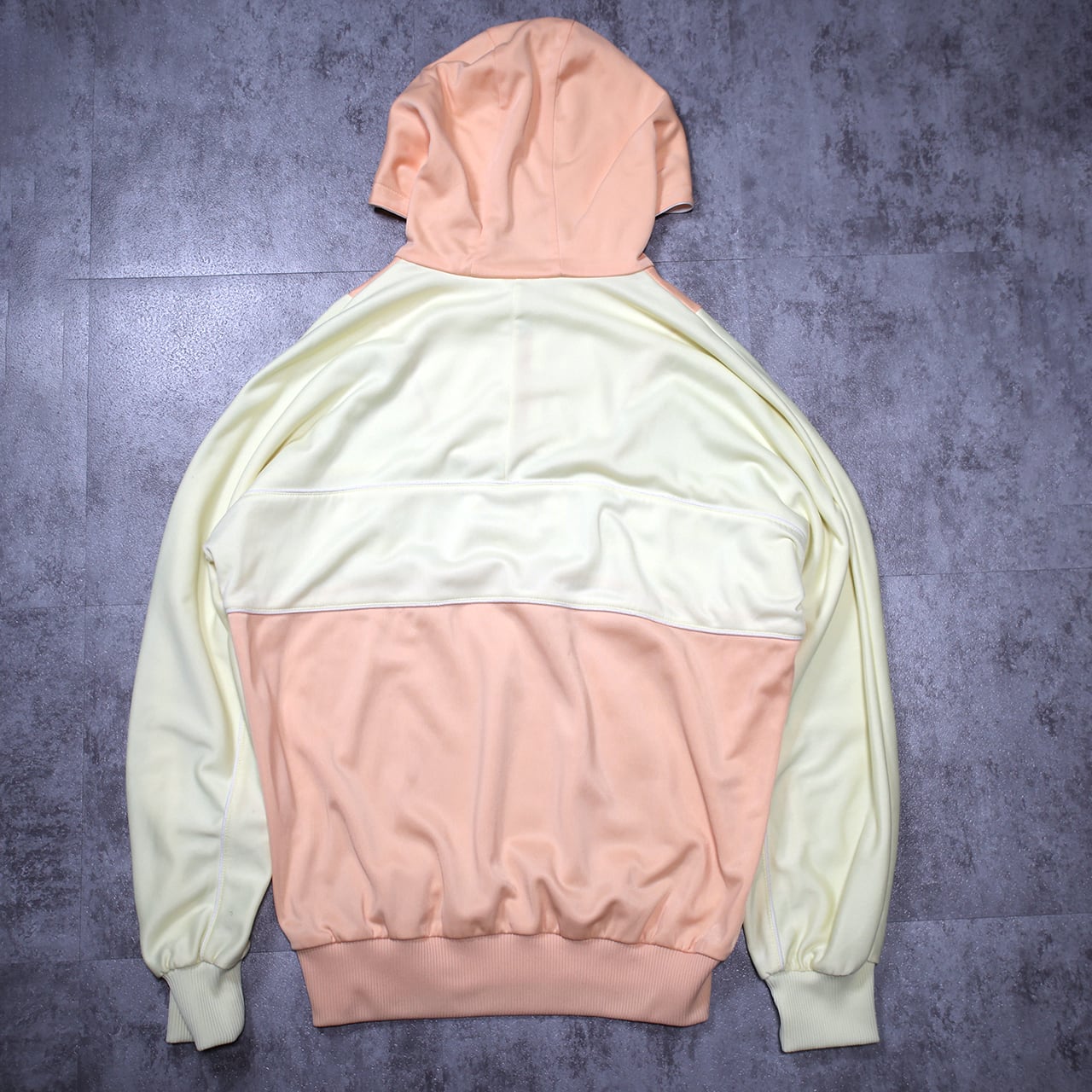 アディダス オリジナルスのパステルカラーブロックフーディ。淡いクリーム × ピーチの配色は市場でもかなり珍しく、柔らかい雰囲気とスポーティさを併せ持つ1枚です。