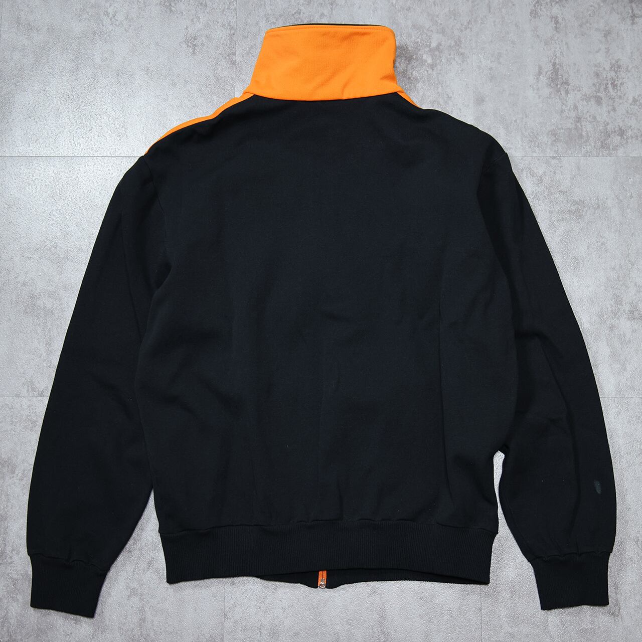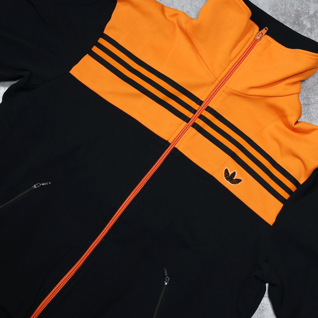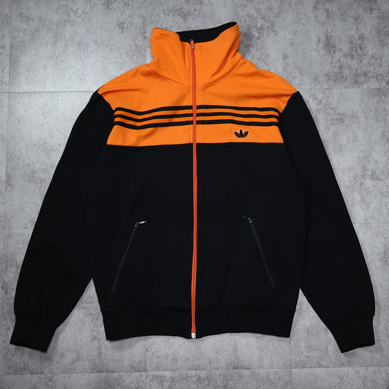 鮮やかなオレンジ × ブラックのカラーブロックに、胸元のスリーストライプスと小ぶりのトレフォイル刺繍が映えるクラシックデザイン。現行にはない配色・質感を持つため、80sアディダスの中でも特に人気の高いモデルです。