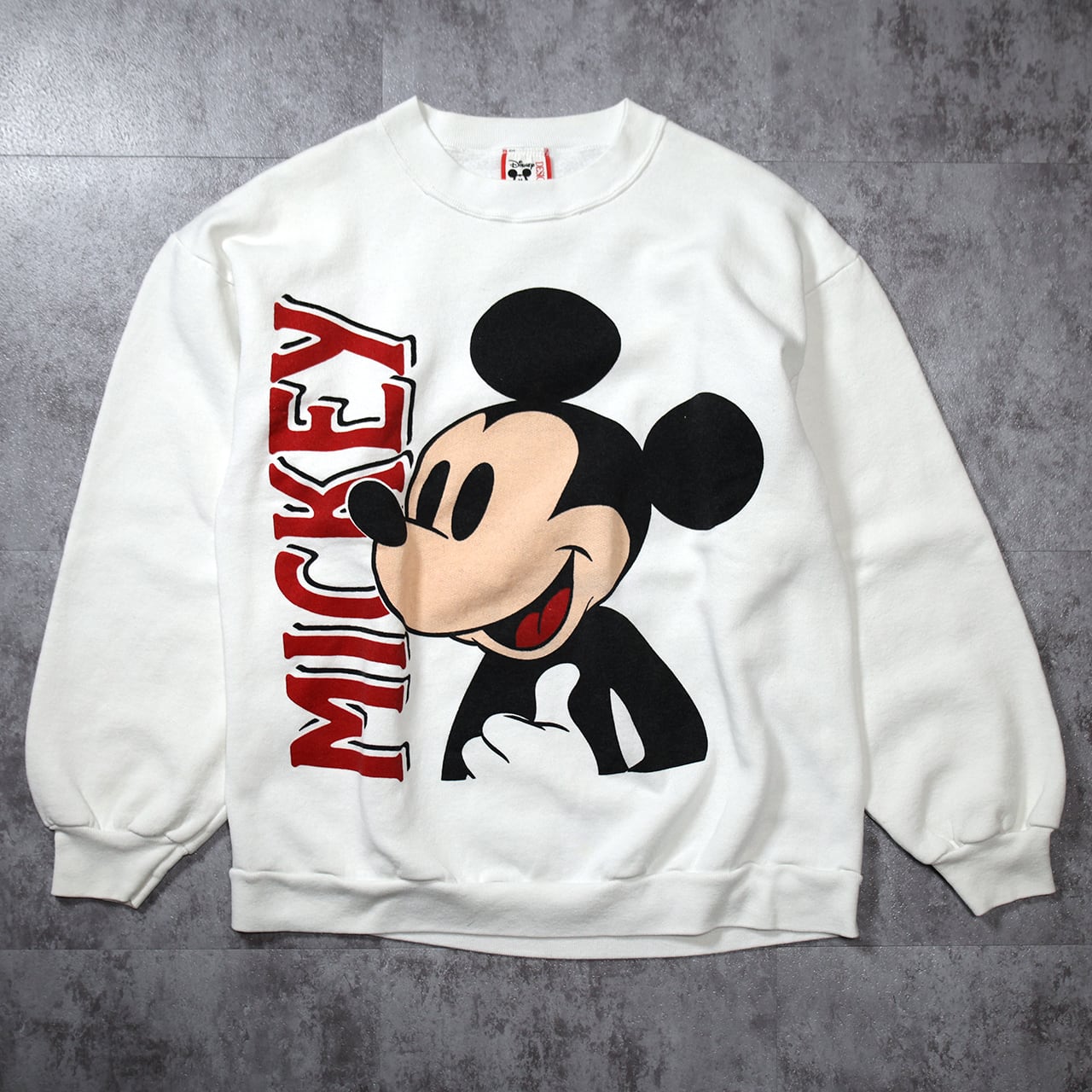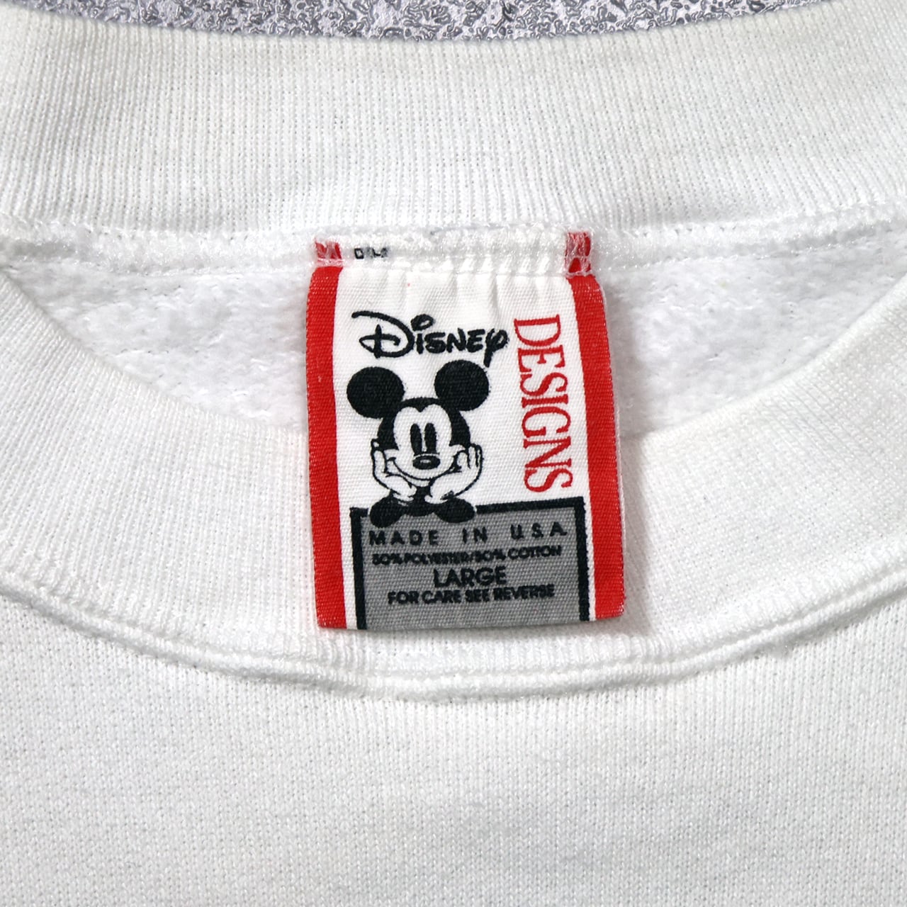 ホワイトボディにブラック×レッドの配色はコントラストが美しく、90sらしい存在感のある仕上がり。タグは「Disney DESIGNS」のUSA製で、当時のディズニーアパレルらしいしっかりとしたボディも魅力です。