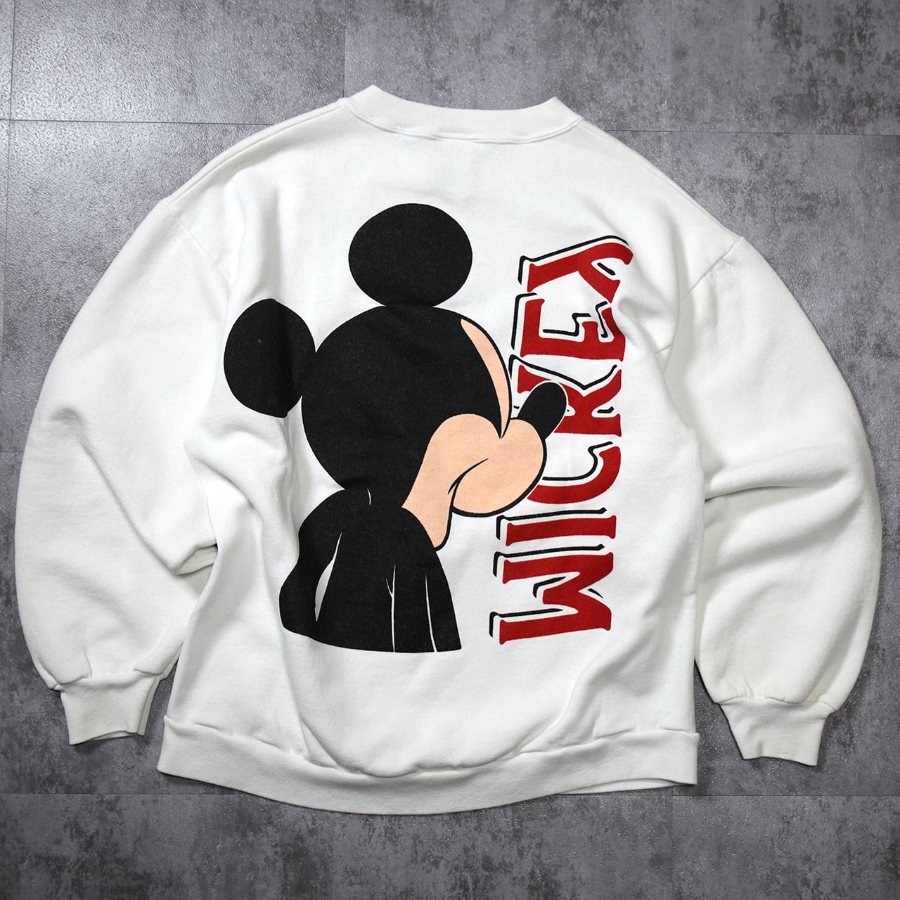 90年代ディズニーのフロント&バック両面プリント仕様スウェット。フロントには大判ミッキーフェイス、バックには後ろ姿と縦ロゴを大胆に配した、視認性の高いデザインが特徴です。