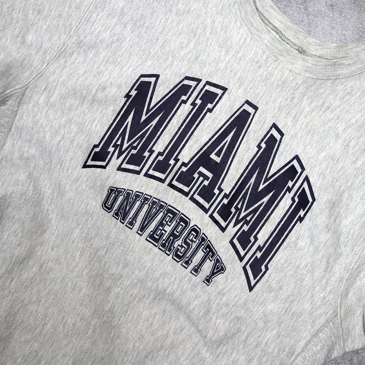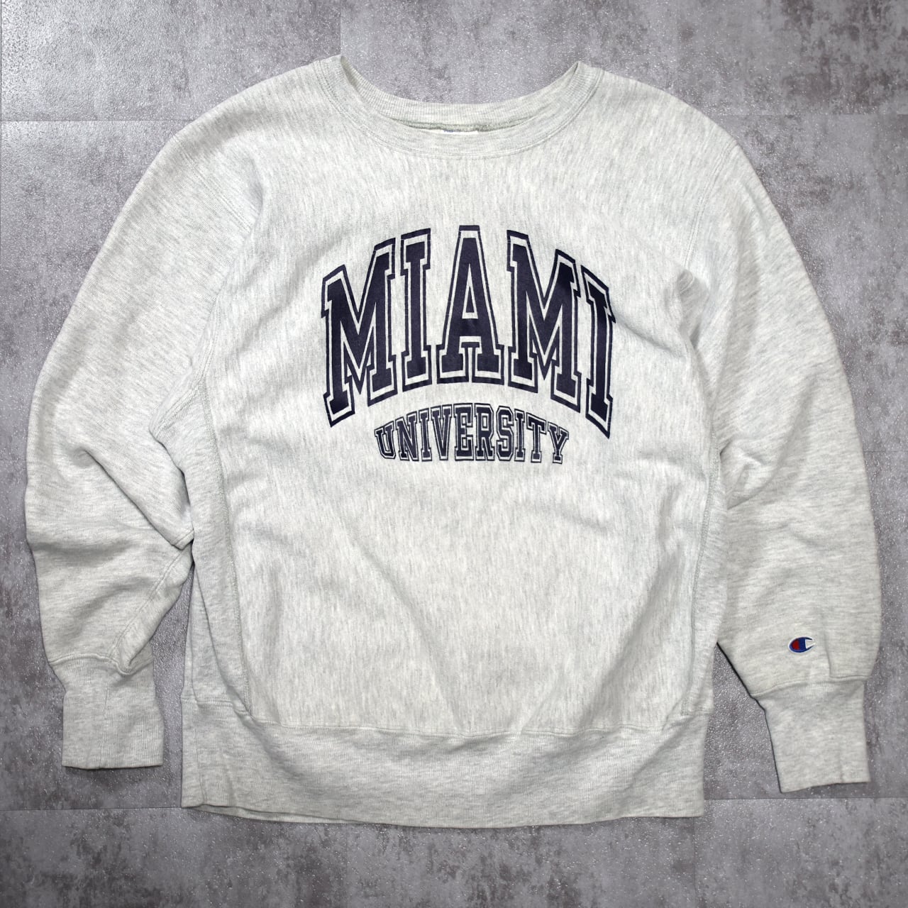 MIAMI UNIVERSITYのアーチロゴが入る、90年代Championリバースウィーブ。