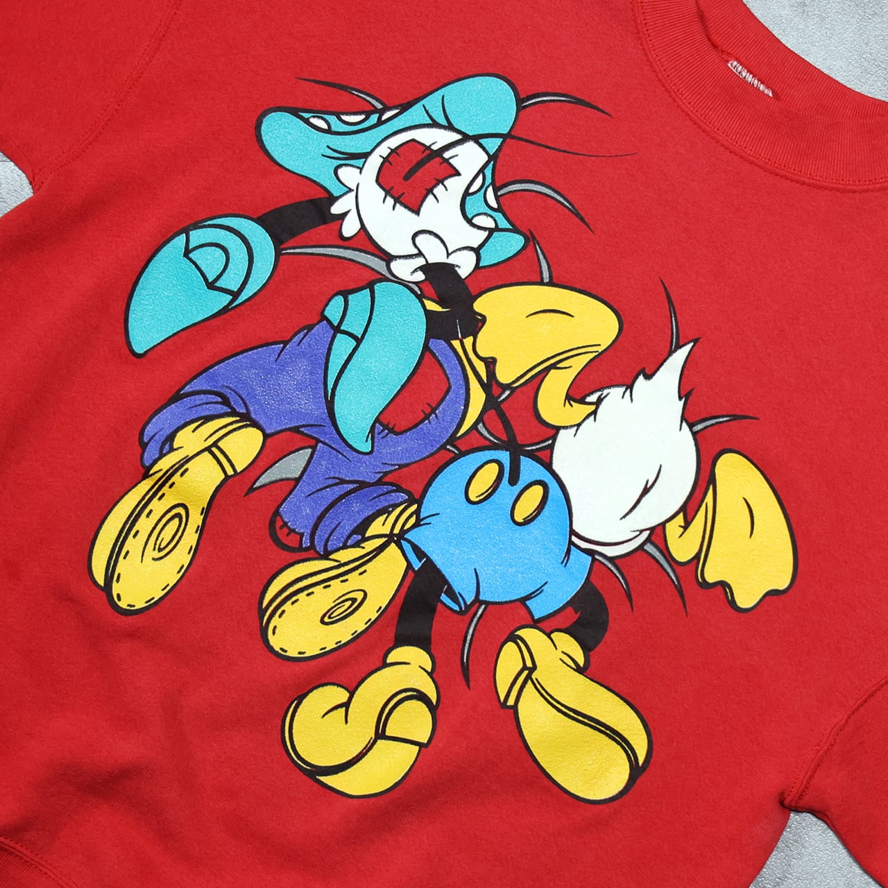 ミッキー、ミニー、ドナルド、グーフィーが大胆に描かれた、インパクトのあるグラフィックスウェット。