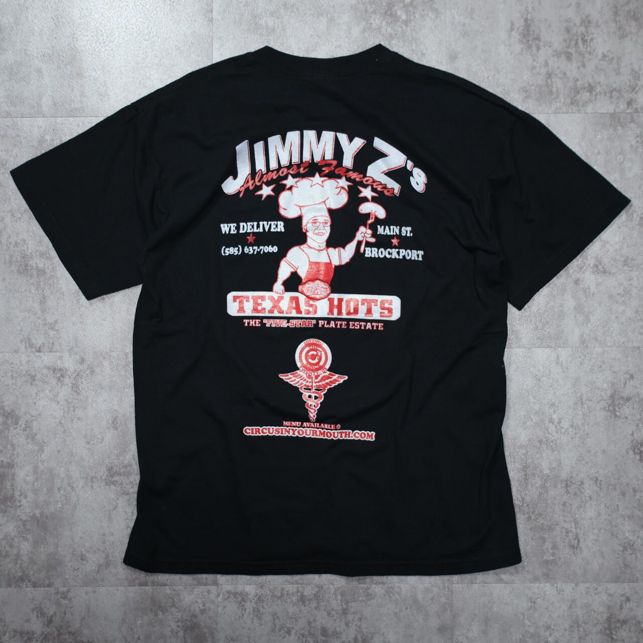 フロントにはおなじみの「No Ghost」マークに眼鏡をかけたゴースト、バックにはアメリカ・ニューヨーク州ブロックポートの実在するレストラン「Jimmy Z’s Texas Hots」のロゴが大胆に配置された一枚。